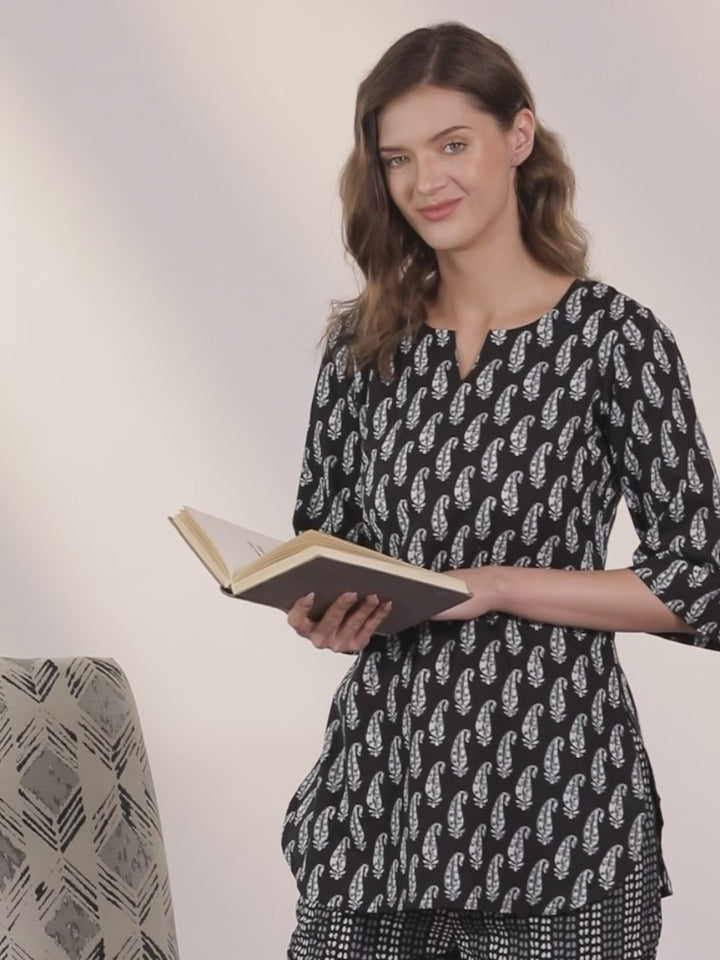 Our 2-piece black printed cotton loungewear set features ethnic motifs printed kurta with a notched neckline and three-quarter sleeves. Complemented with a printed slip-on straight-fit pyjama with roomy pockets, this outfit is ideal for effortless everyday wear.