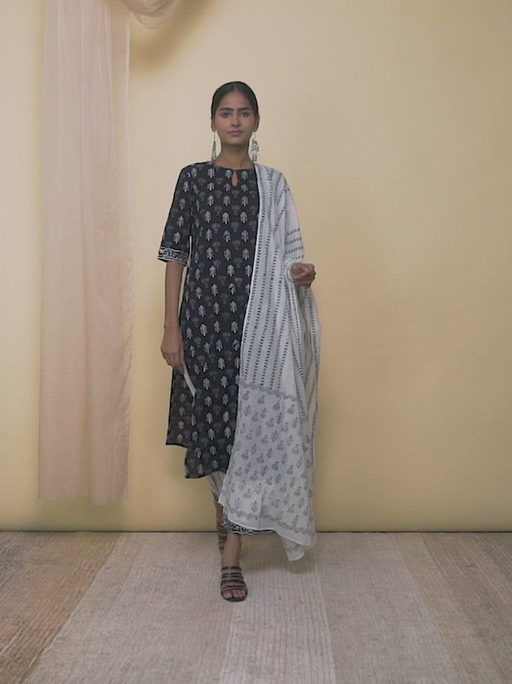 Black Printed Cotton Straight Kurta With Palazzos & Dupatta