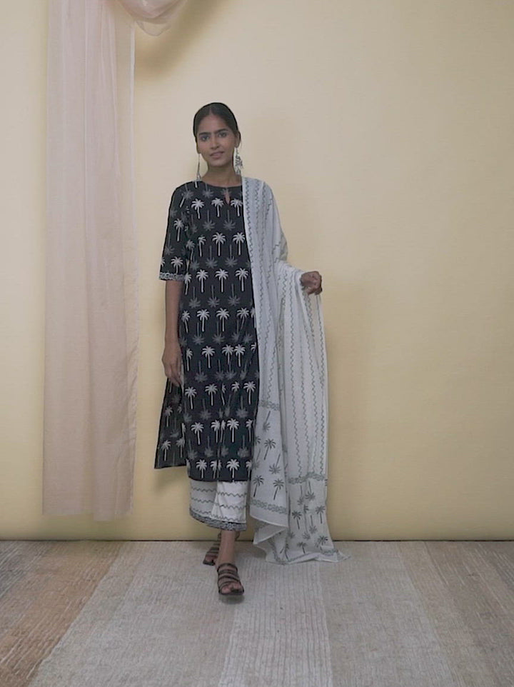 Black Printed Cotton Straight Kurta With Palazzos & Dupatta