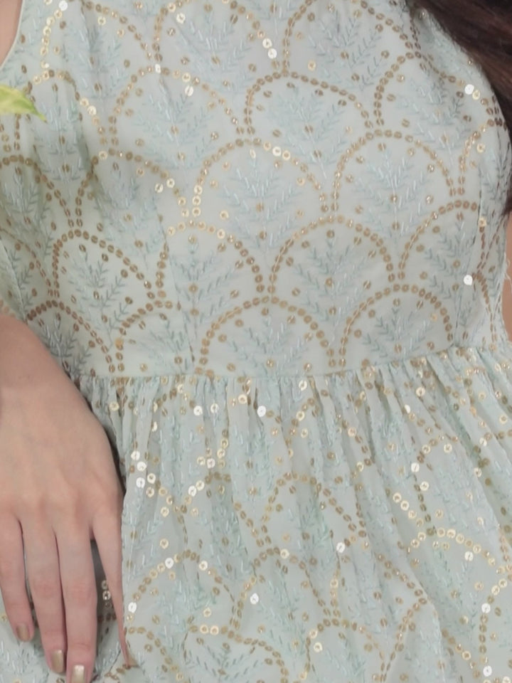 Our 3-piece blue and gold embroidered georgette suit set features a sleeveless A-line kurta with a round neckline. Complemented with chevron-styled palazzo pants and a dupatta. Adorned with sequin accents, this refreshing style is perfect for festivities.