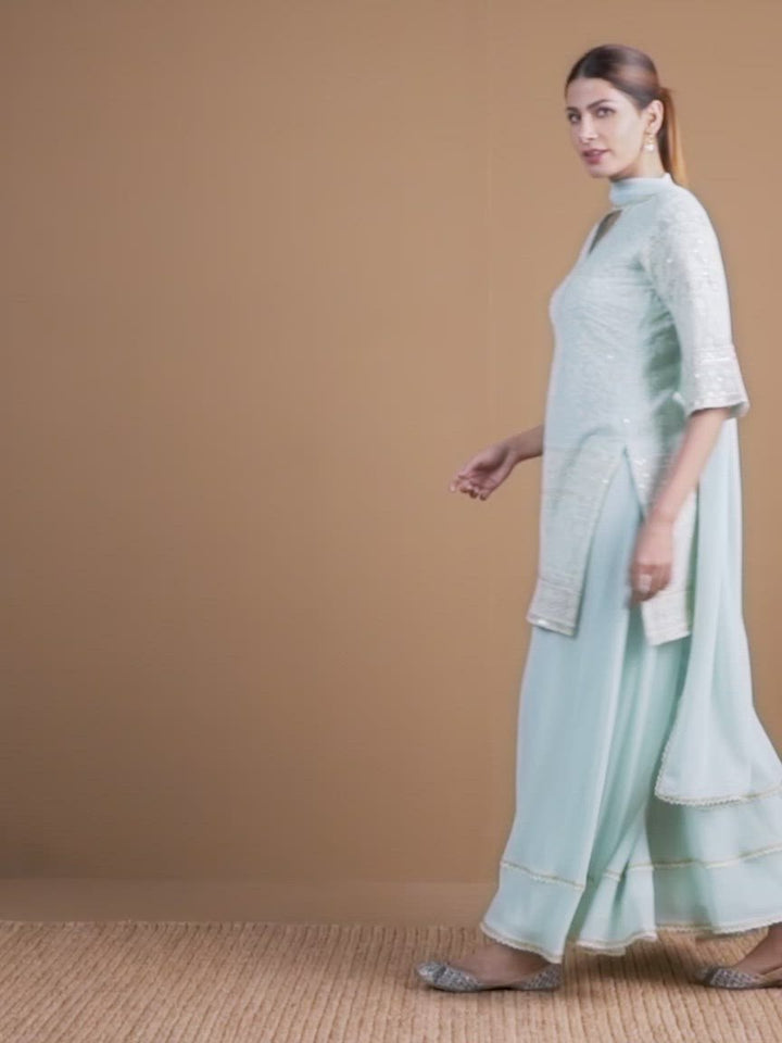 This 3-piece suit set includes our pastel blue v-neck short kurta, flared palazzo pants and a matching dupatta. Embroidered in a combination of floral and geometric motifs and delicate lace details. Perfect for intimate dinners.