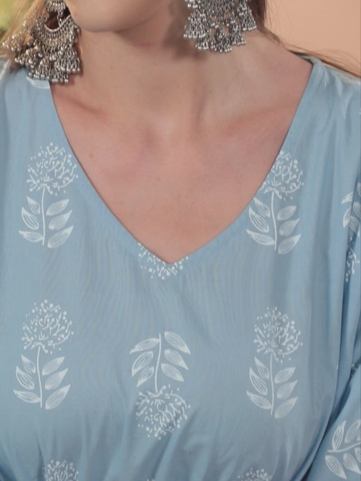 Our 2-piece blue cotton Kaftan set features a floral printed kaftan with V-neckline, and three-quarter sleeves, and straight pants with a partially elasticated waistband and roomy pockets. Ideal for lounging or casual outings.
