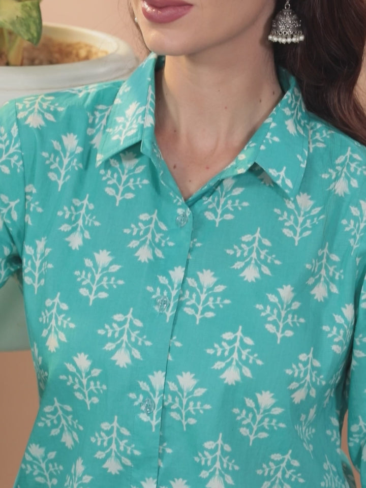 Our 2-piece blue cotton loungewear set features a floral printed kurti with a shirt collar and three-quarter sleeves. Complemented with a straight slip-on pyjama pants with roomy pockets. Ideal for lounging or casual outings.