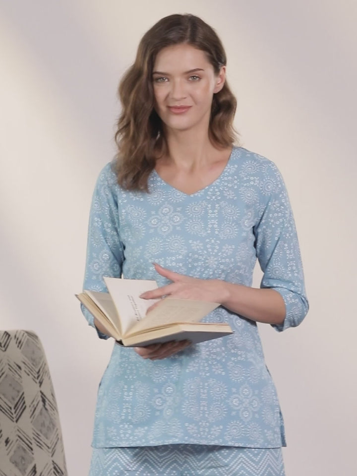 Our 2-piece blue cotton loungewear set features ethnic motifs printed kurta with a V-neckline and three-quarter sleeves. Complemented with printed slip-on pyjama pants. Ideal for lounging or casual outings.