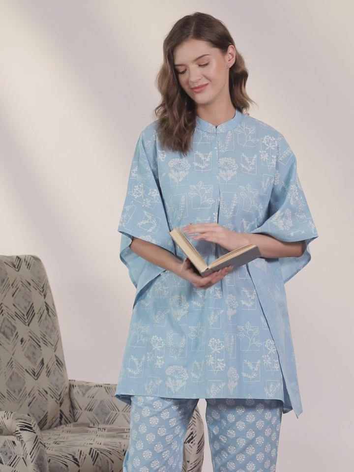 Our 2-piece blue cotton loungewear set features ethnic motifs printed kaftan kurti with a mandarin collar and three-quarter sleeves. Complemented with a printed slip-on pyjama with roomy pockets, this style is ideal for lounging in as well as running errands.
