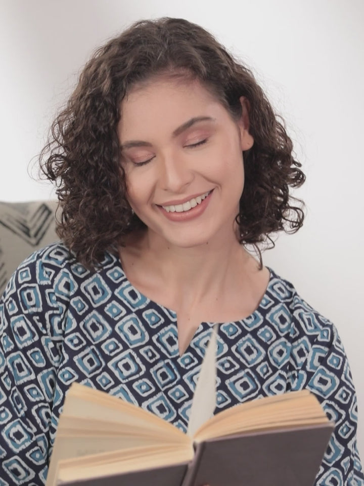Our 2-piece navy blue and white geometric print cotton night suit set features a notched neck kurti with three-quarter sleeves. Complemented with palazzo slip-on pants, this comfortable style is ideal for lounging in or running errands.