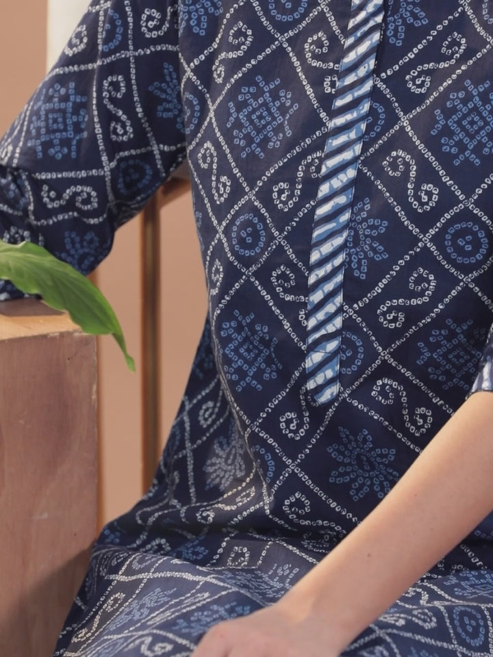 Our 3-piece blue cotton suit set highlighted by a Bandhani print features an straight-fit kurta with a notched neckline, three-quarter sleeves, straight pants with a partially elasticated waistband, and a dupatta in chevron print. Adorned with delicate lace-trim detailing, this style is perfect for work and beyond.
