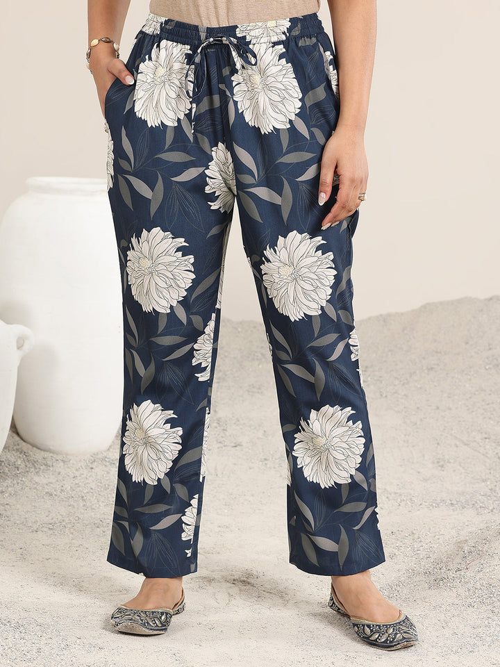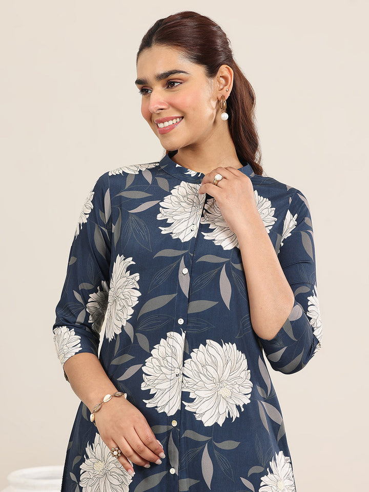 Our 2-piece Navy Blue printed Poly Crepe co-ord set features a Straight-fit Tunic with a Mandarin Collar neckline and Three-quarter sleeves. Complemented with matching Trousers with an Elasticated waistband and 2 pockets. Highlighted with Printed, this style is perfect for Casual wear.