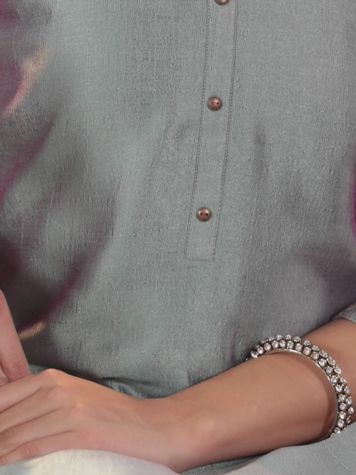 Our grey straight-fit kurta, crafted in soft silk fabric, features a round neckline and three-quarter sleeves. Adorned with threadwork accents, this comfortable style is ideal for work and beyond.
