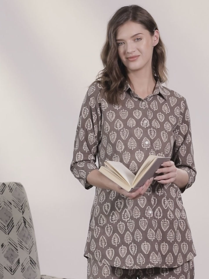 Our 2-piece brown printed cotton loungewear set features an ethnic motifs print kurti with a shirt-collar and three-quarter sleeves. Complemented with a printed slip-on pyjama with roomy pockets, this style is ideal for lounging in as well as running errands.