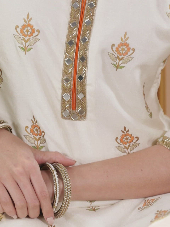 Our 3-piece cream-tone floral printed soft silk suit set features a straight-fit kurta with a notched neckline, mirrorwork and Gota Patti detailing. Complemented with palazzo pants with a partially elasticated waist, and a complementing satin dupatta. This refreshing style is perfect for daytime festivities.