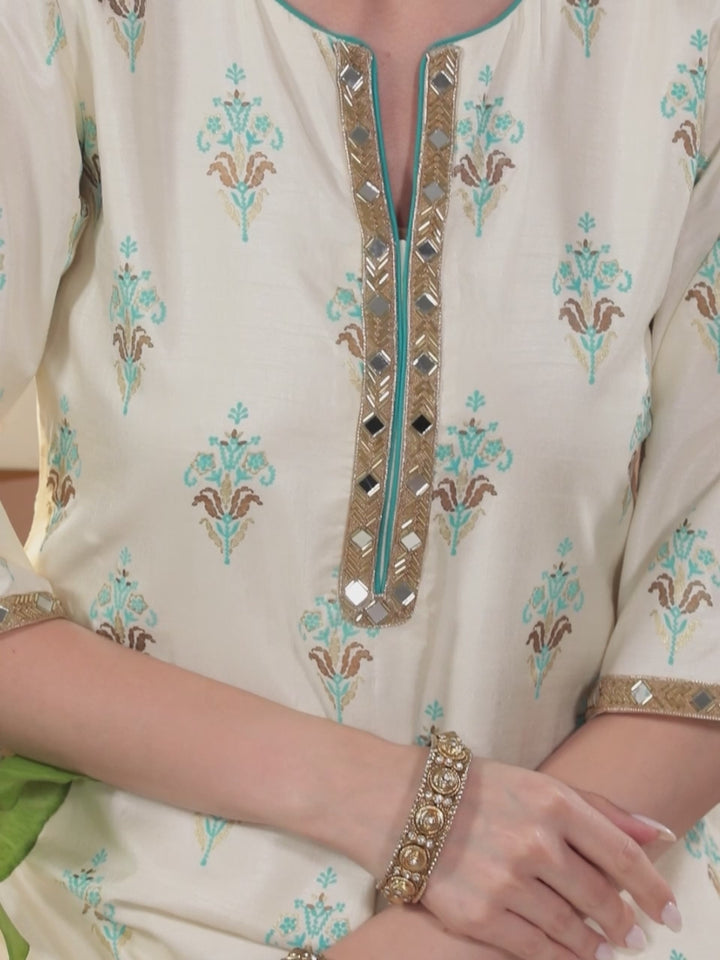 Cream Printed Silk Straight Kurta With Palazzos & Dupatta