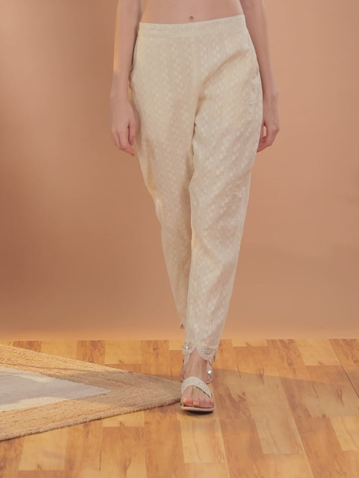 Our cream cotton trousers feature a partially elasticated waistband, flat-front with no pleats design, and mid-rise waist style with slip-on closure and roomy pockets. Adorned with a lace-trim accents, this intricate style is perfect for casual outings.