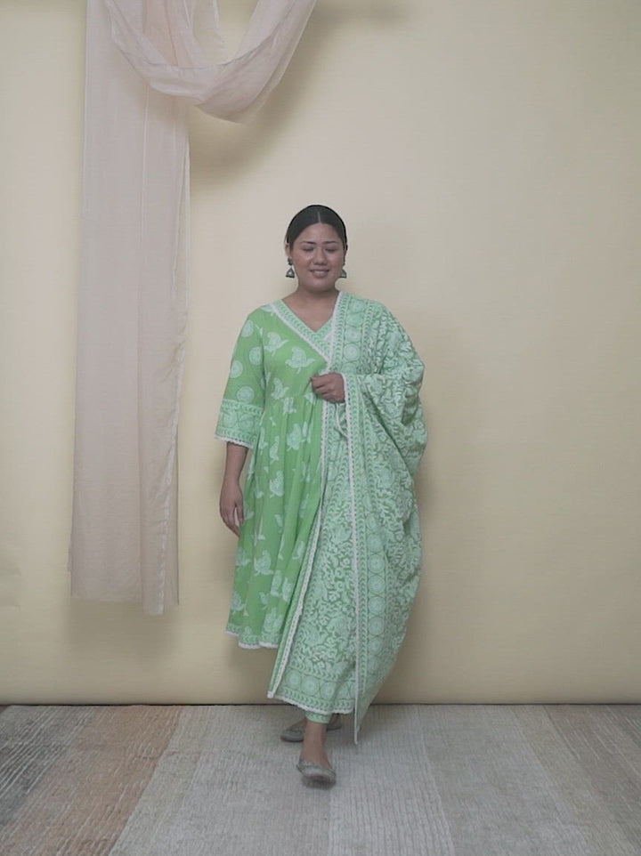 Plus Size Green Printed Cotton Anarkali Kurta With Palazzos & Dupatta
