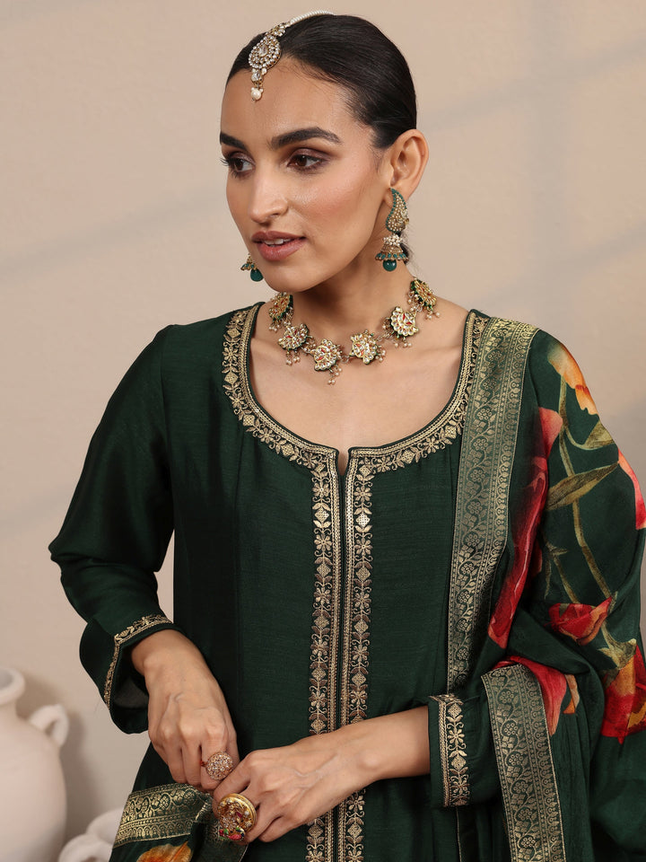 Green Embroidered Silk Blend A-Line Suit Set With Dupatta