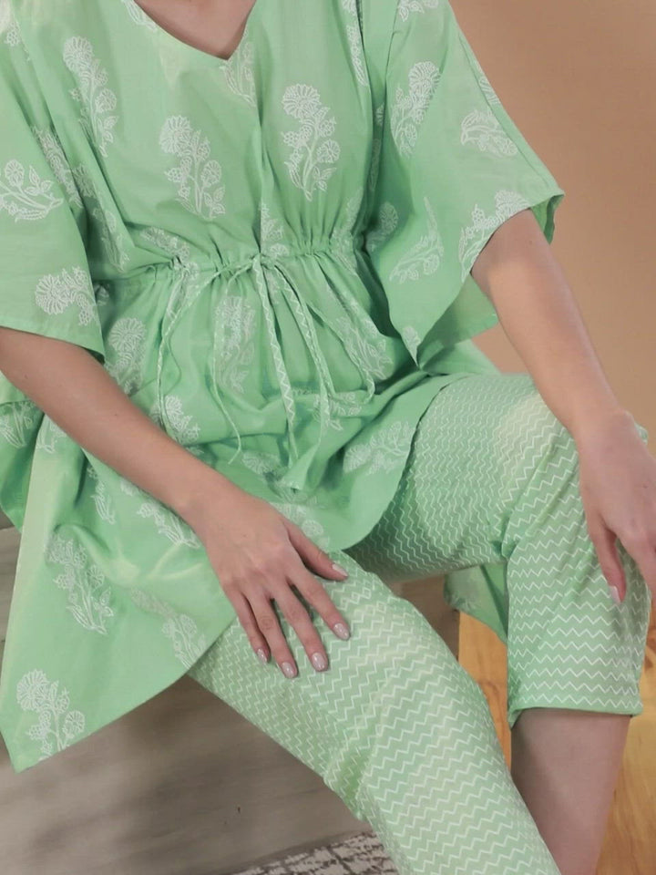 Our 2-piece sage green cotton night suit set features a floral printed kaftan kurta with a V-neckline and three-quarter sleeves. Complemented with chevron printed straight slip-on pyjama pants with roomy pockets. Ideal for lounging-in or running errands.