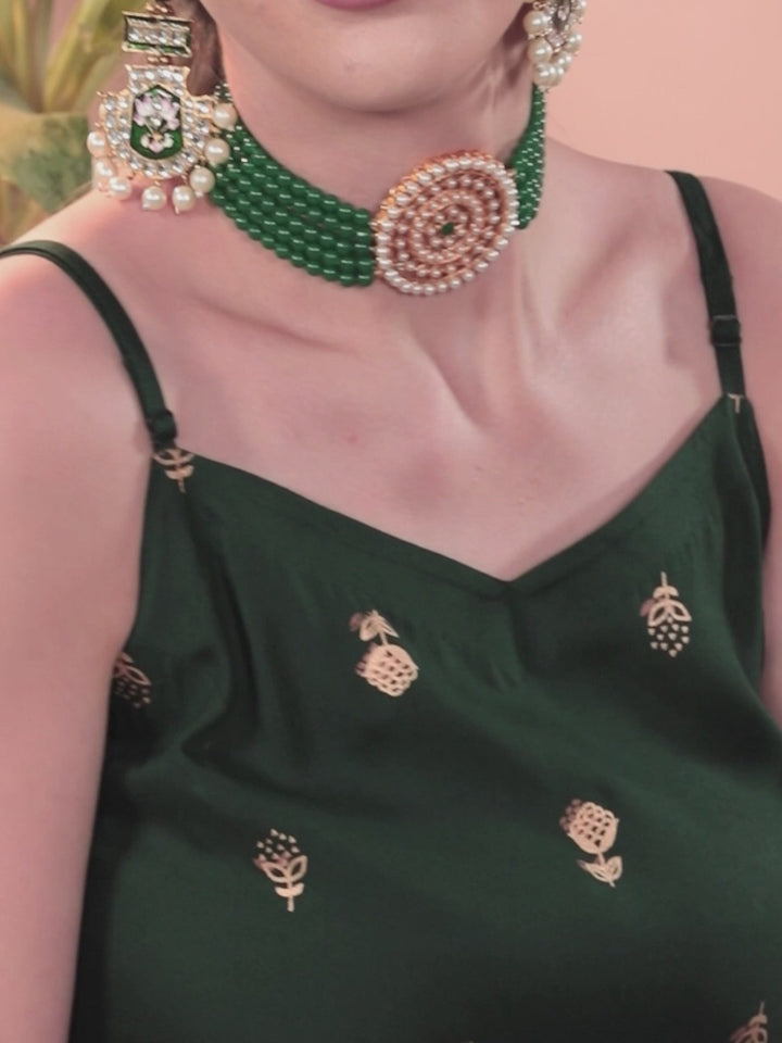 Our 3-piece green, rust orange and gold printed rayon suit set features a sleeveless straight-fit kurta with a round neckline. Complemented with printed palazzo pants with a partially elasticated waistband and roomy pockets, and a solid dupatta. This refreshing style is perfect for festivities.