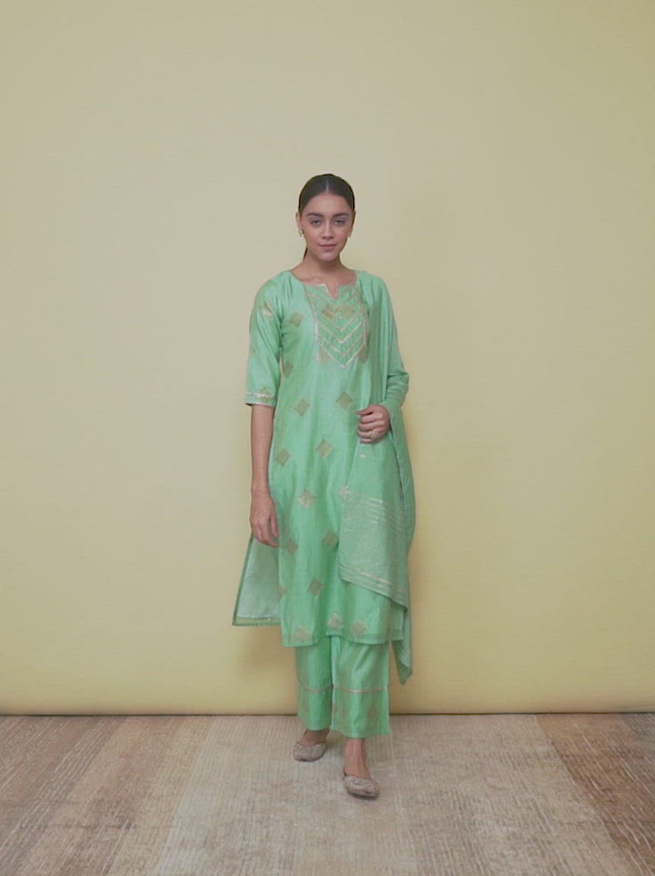 This 3-piece suit set includes our mint green round neck straight kurta, straight palazzo pants and a matching dupatta. Featuring a striking yoke crafted with a notched neckline and detailed with tinted motifs and Gota Patti details. Ideal for festive celebrations.