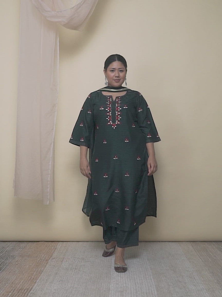 Plus Size Green Embroidered Silk Straight Kurta With Palazzos & Dupatta