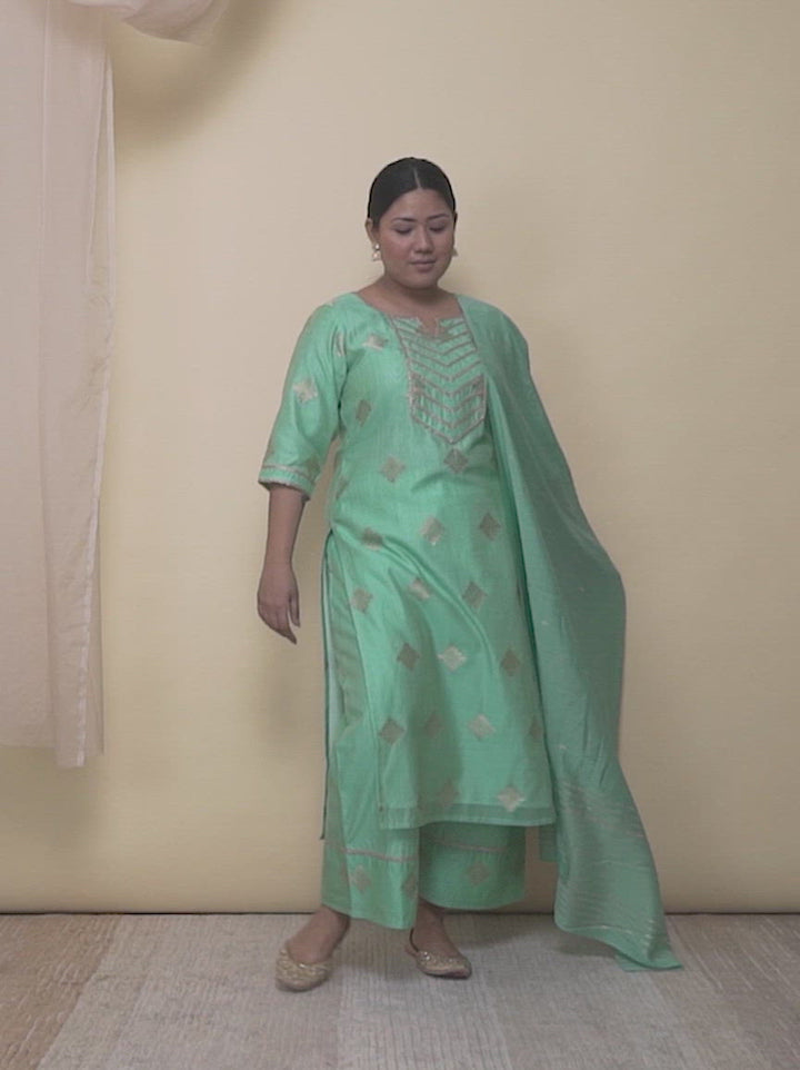 This 3-piece suit set includes our mint green round neck straight kurta, straight palazzo pants and a matching dupatta. Featuring a striking yoke crafted with a notched neckline and detailed with tinted motifs and Gota Patti details. Ideal for festive celebrations.