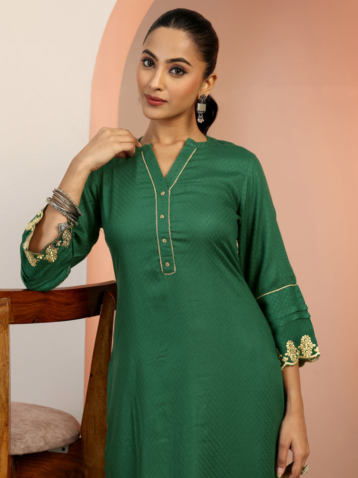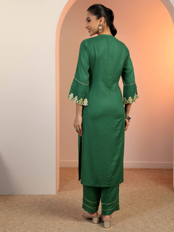 Our 2-piece Green Rayon Straight-fit features a V-Neckline, Bell Sleeves, and statement Yoke. Complemented with Straight Pants with a Partially Elasticated waistband and 2 pockets. Adorned with Solid, this style is perfect for Work Wear and Casual Wear.