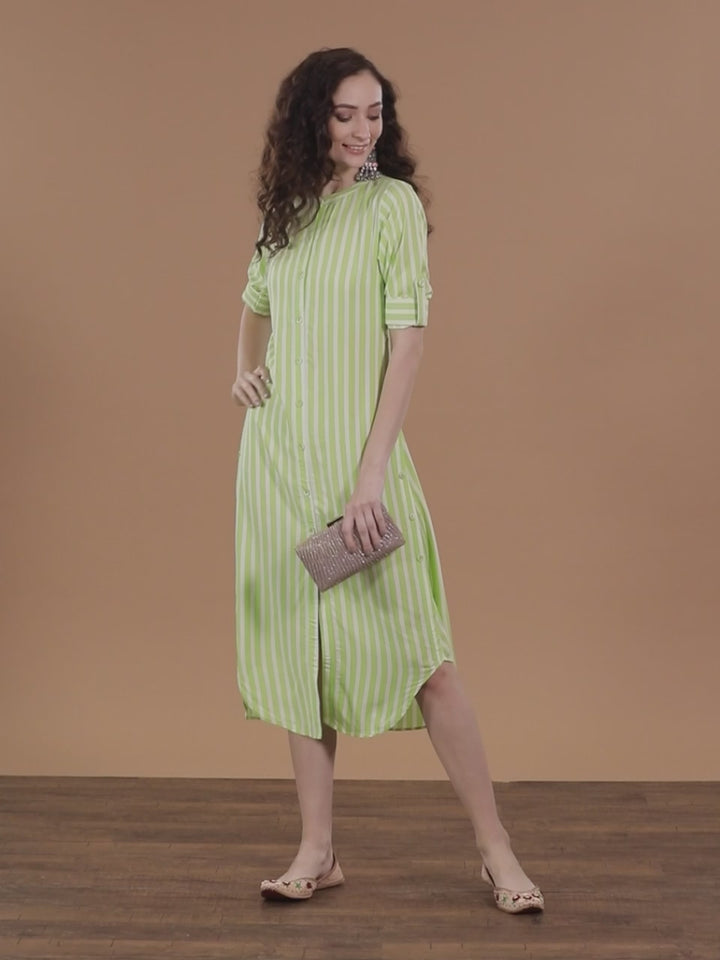 Our lime green midi A-line dress, crafted in soft rayon fabric, features a round neckline, striped print, three-quarter roll-up sleeves, a stylish front-slit and a flared hemline. This chic style ideal for casual outings.