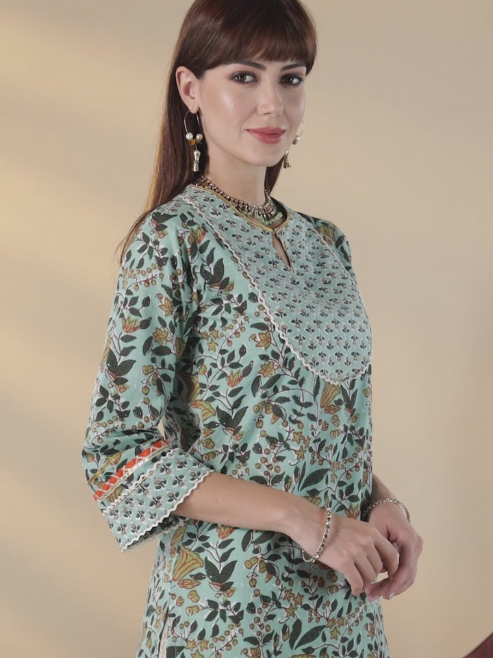 Our green and beige straight shape cotton kurta features a keyhole neckline, handmade fabric buttons, floral and ethnic motifs print, and three-quarter sleeves. This style is perfect for daytime festivities.
