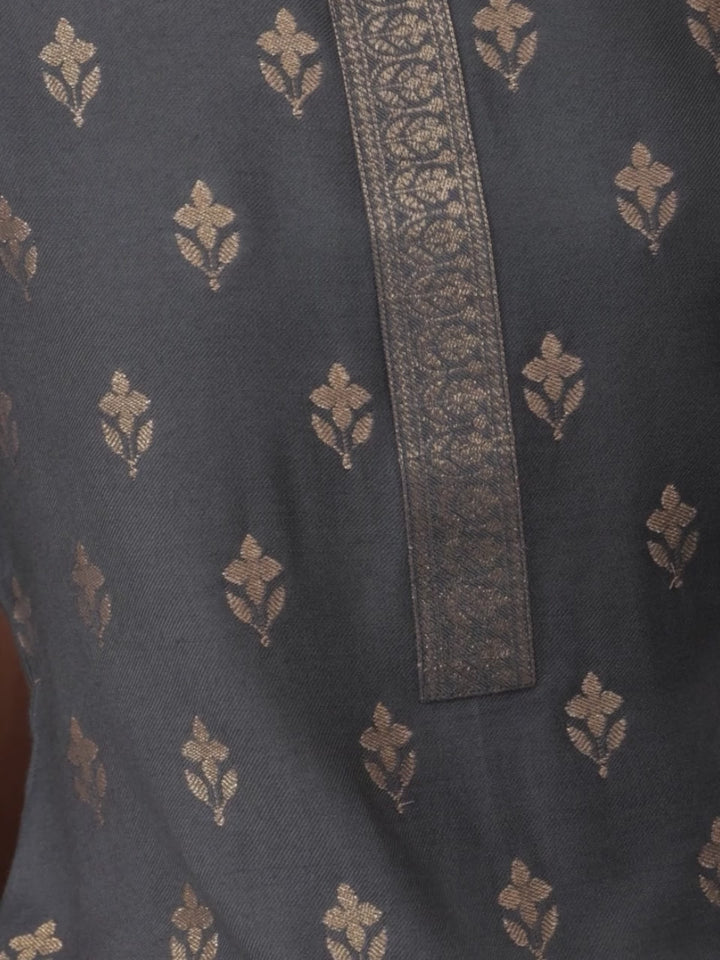 Our 3-piece grey suit set with floral motifs features a Pashmina Wool Kurta with a round neckline and long regular sleeves. Elevated with intricate zari work on its solid trousers and kurta, this set is complemented with a self-design dupatta and is ideal for both daytime and nighttime festivities.