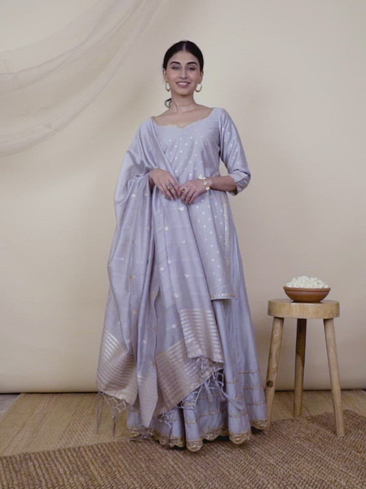 Grey Self Design Silk Straight Kurta With Skirt & Dupatta