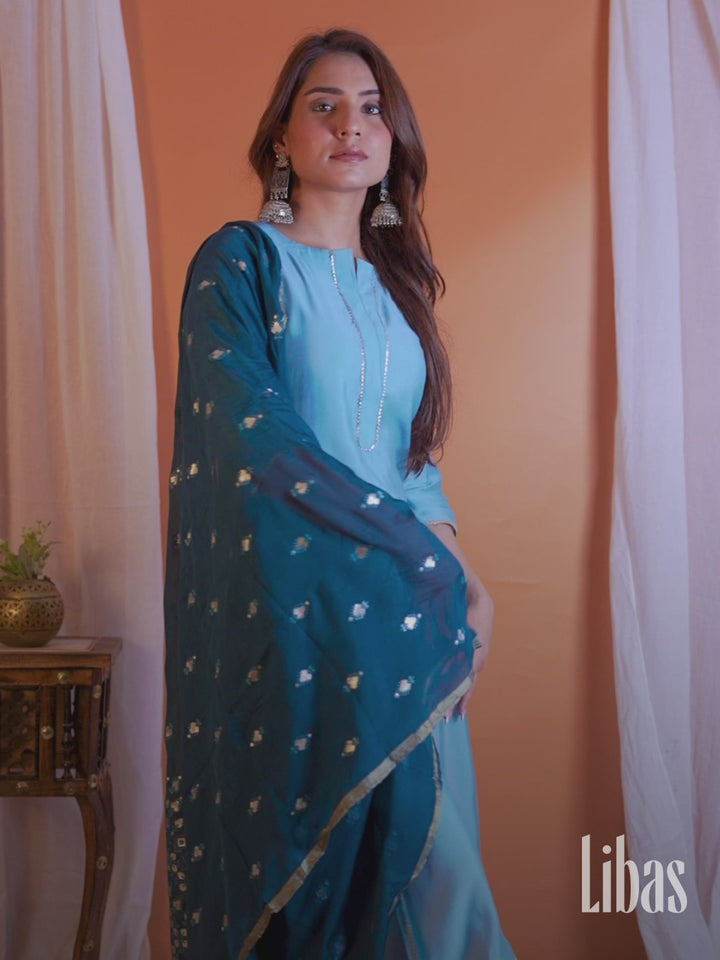 Our 3-piece blue solid-tone Silk blend suit set features a straight-fit kurta with a notched neckline and three-quarter sleeves. Complemented with palazzos with a partially elasticated waistband and roomy pockets, and a printed dupatta. Adorned with Gota Patti detailing, this style is perfect for casual outings.
