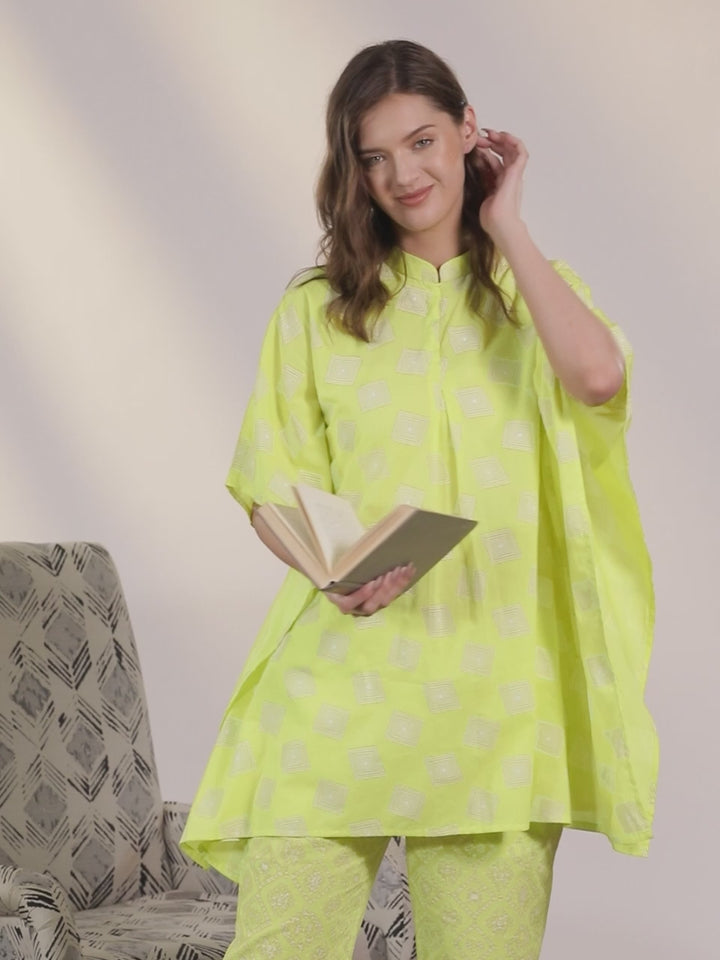 Our 2-piece lime green cotton loungewear set features a floral print kaftan with a sleek mandarin collar and three-quarter sleeves. Complemented with printed straight slip-on pyjama pants with roomy pockets. Ideal for lounging or casual outings.