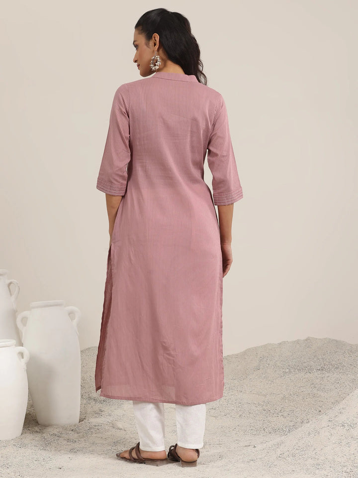 Our mauve cotton blend straight kurta features a mandarin-notched neckline and three-quarter sleeves. Elevated with a striped pattern, stylish buttons, roomy pockets and fabric-trim accents, this refreshing style is ideal for casual outings.