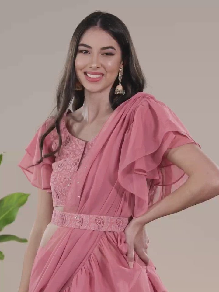 Our mauve saree, crafted in poly georgette fabric, features a solid border. Complemented with an unstitched blouse with a ruffled design. Elevated with delicate sequin work, this graceful style is perfect for light festivities.