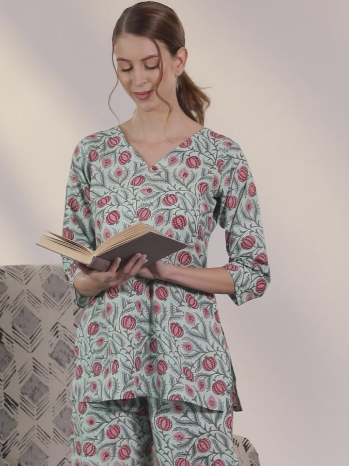 Our 2-piece sea green cotton night suit set features a floral printed kurti with a V-neckline and three-quarter sleeves. Complemented with a printed slip-on pyjama with roomy pockets, this style is perfect for both lounging in and out.