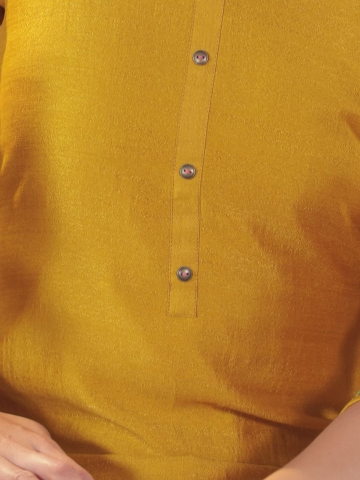 Our mustard yellow straight-fit kurta, crafted in soft silk fabric, features a round neckline and three-quarter sleeves. Adorned with threadwork accents, this comfortable style is ideal for daytime festivities.