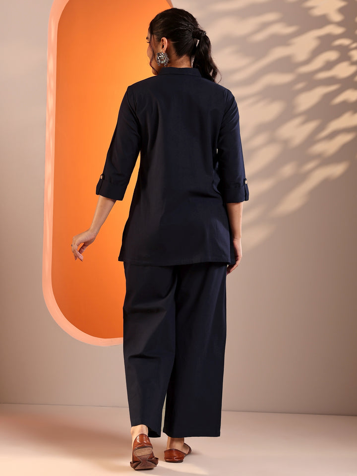 Navy Blue Embroidered Cotton Blend Co-Ord Sets
