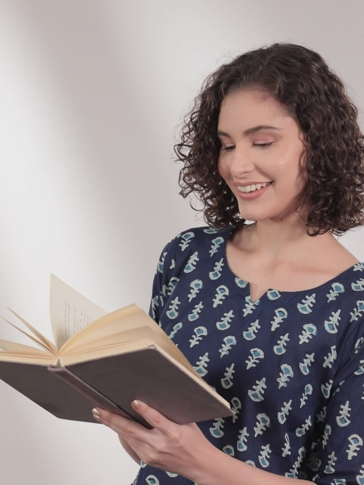 Our 2-piece navy blue and white block print cotton night suit set features a notched neck kurti with three-quarter sleeves. Complemented with palazzo slip-on pants, this comfortable style is ideal for lounging in or running errands.