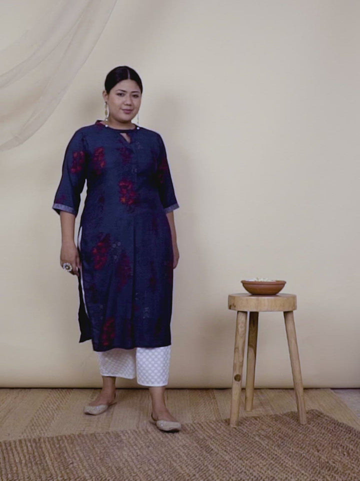 This Navy Blue round collar kurta is crafted in a straight cut with side slits. Crafted in rayon, featuring abstract-pattern florals with bright accents detailed with contrasting trims in a keyhole neckline. Comfortable for daily wear.