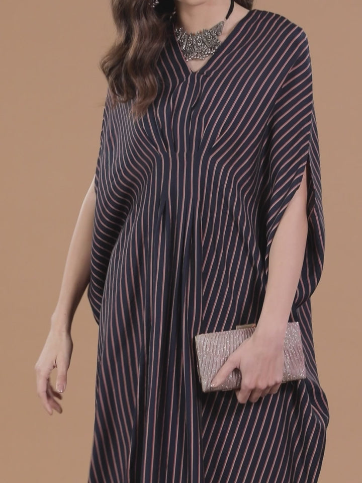 Our navy blue kaftan silk blend dress features a V-neckline, and flared sleeves with side slits and a high-low hemline. This stylish dress is ideal for casual outings.