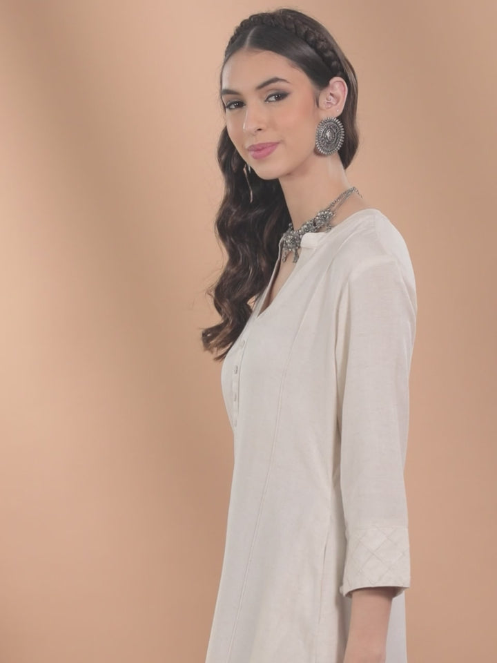 Our off-white cotton kurta features a notched neckline, handmade fabric buttons on the yoke, and three-quarter sleeves. Complemented with a roomy pocket, this refreshing style is perfect for elevated everyday wear.