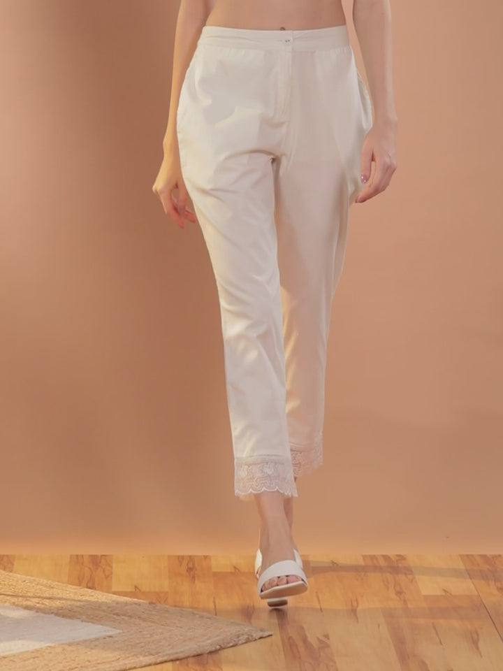 Our off-white woven straight woven trousers feature a partially elasticated waistband, flat-front with no pleats design, narrow lace accents, and mid-rise waist style. Crafted in our cotton fabric and detailed with roomy pockets. Perfect for casual wear.