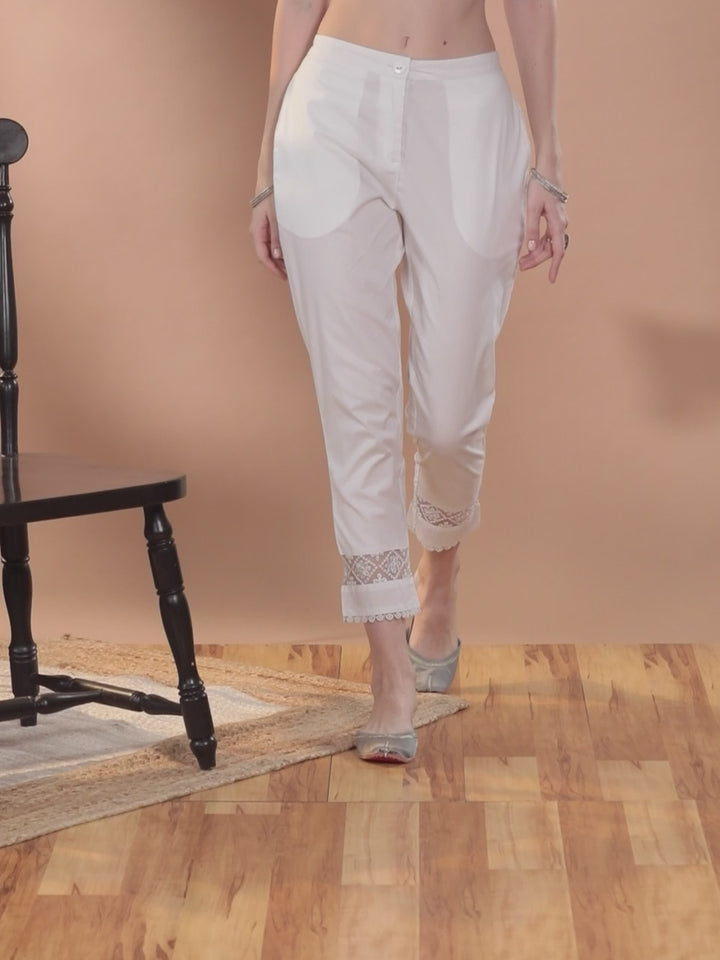 Our white cotton straight-fit trousers feature a partially elasticated waistband, flat-front with no pleats design, and mid-rise waist style with roomy pockets. Adorned with lace detailing, this intricate style is perfect for casual outings.