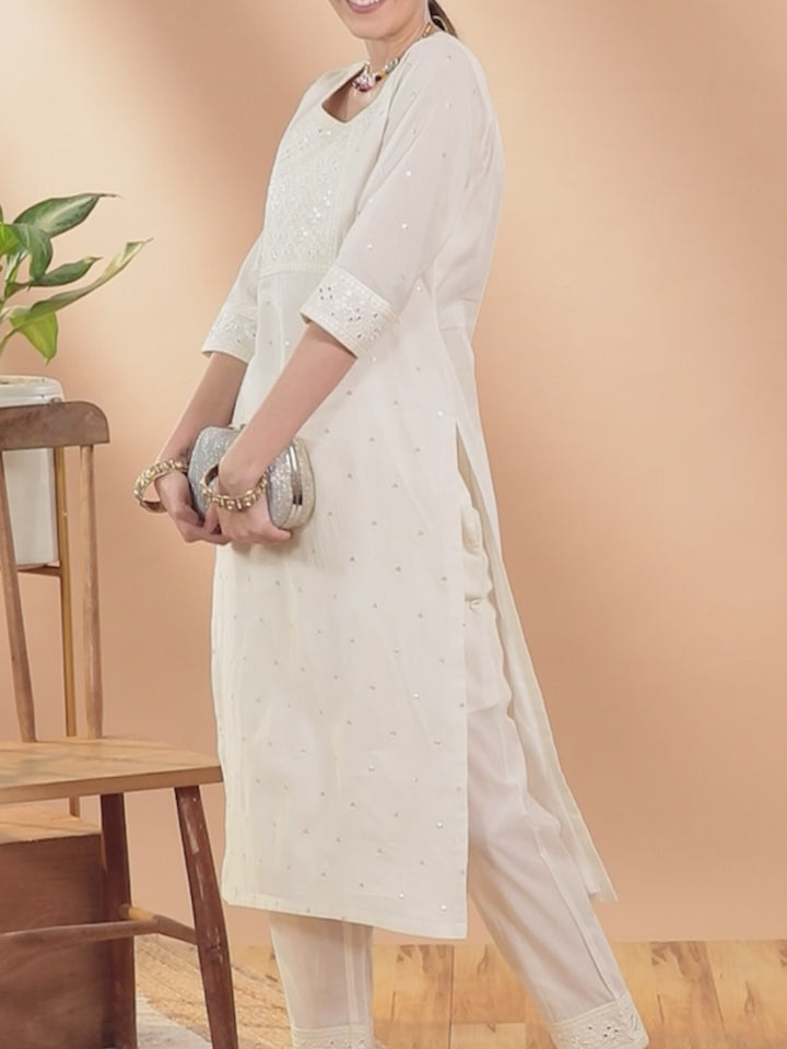 Our off-white cotton straight-fit kurta features a round neck, and three-quarter flared sleeves. Adorned with sequinned detailing, this elegant style is ideal for daytime festivities.