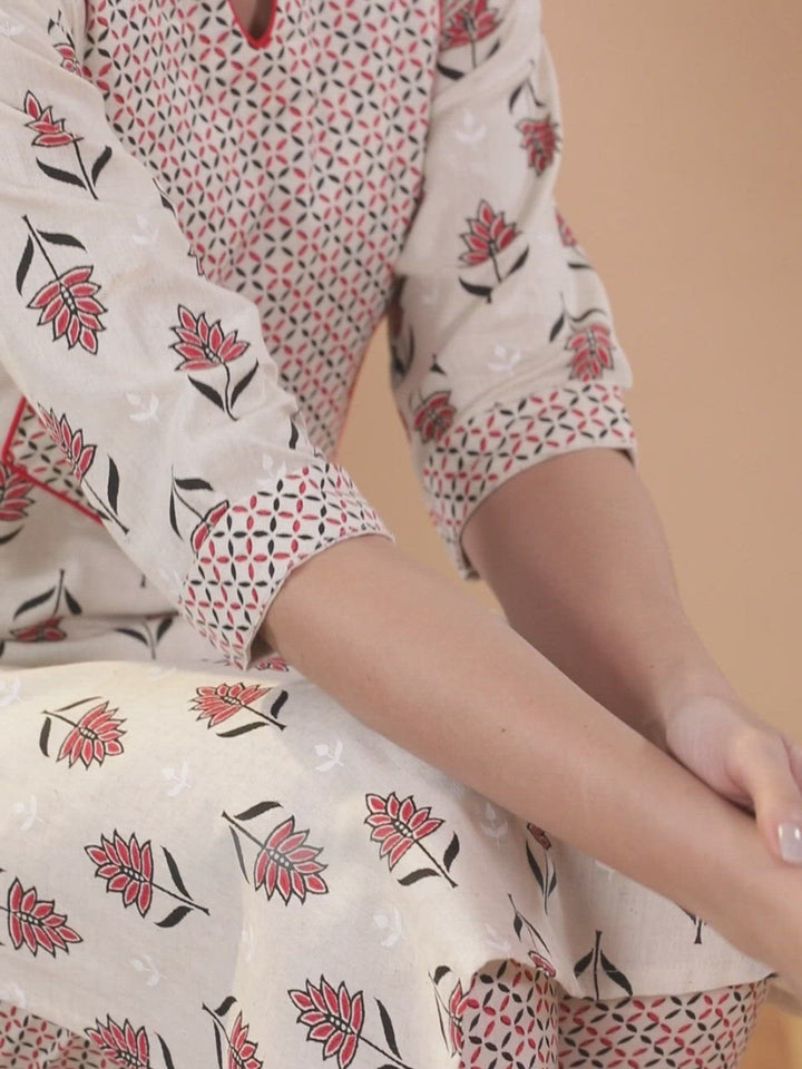 Our 3-piece off-white floral printed cotton suit set features a straight-fit kurta with a notched neckline, delicate piping and fabric-trim detailing. Complemented with straight pants with a partially elasticated waist, and a complementing dupatta. This refreshing style is perfect for casual outings.
