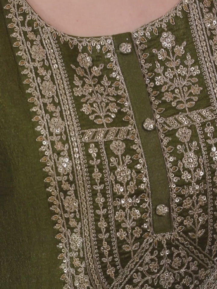 Our olive straight-fit silk kurta features ethnic motifs design, a round neckline, and long regular sleeves. Adorned with sequinned details and fabric button accents, this elegant style is ideal for elevated everyday wear.