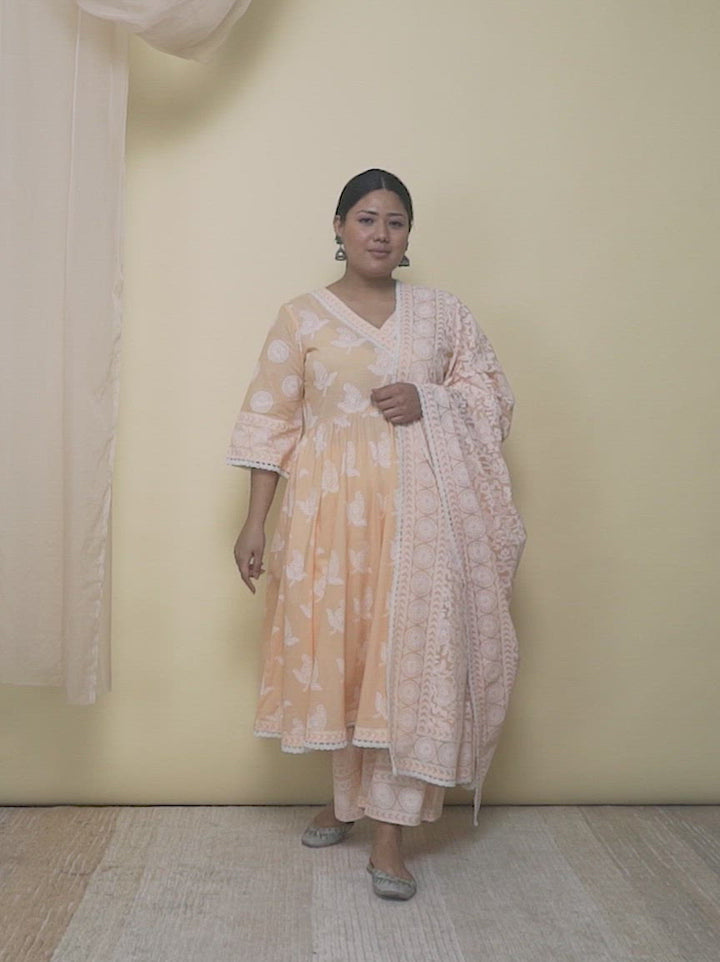 This 3-piece suit set includes our peach Khari print angrakha kurta, straight palazzo pants and matching dupatta. Crafted in cotton for simple comfort. Perfect for day-time celebrations.