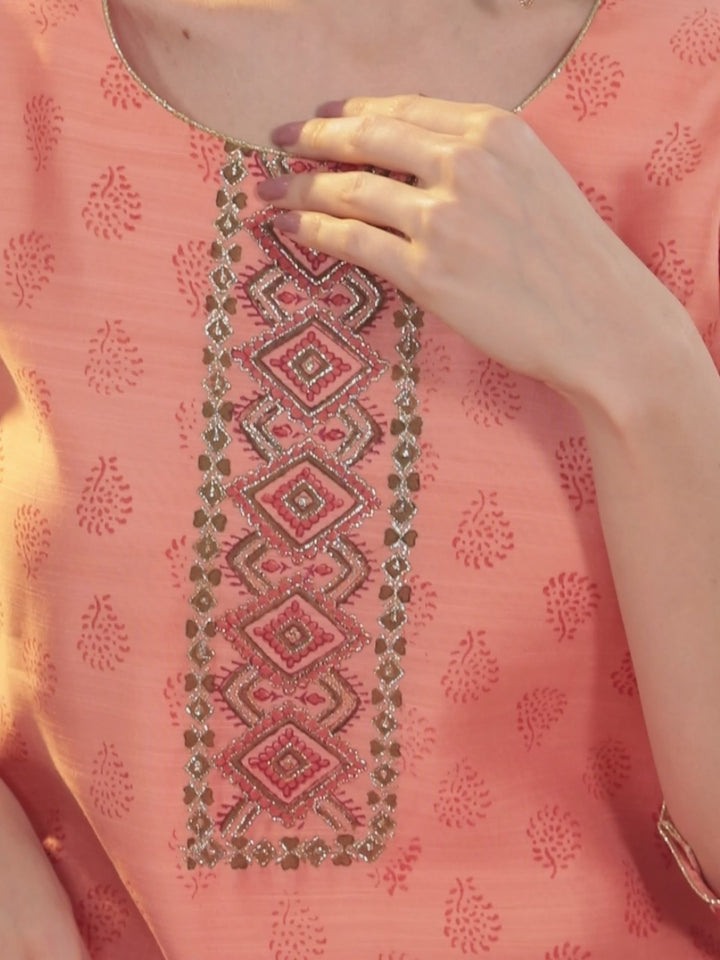 Peach Printed Chanderi Silk Straight Kurta With Dupatta