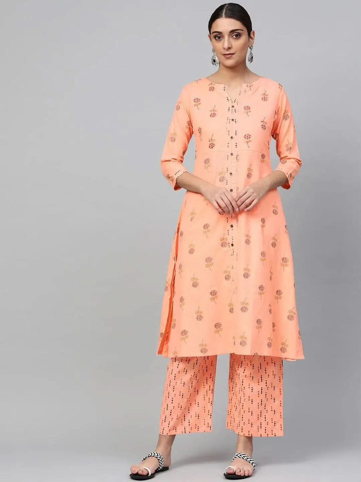 Peach Printed Cotton A-Line Kurta With Palazzos