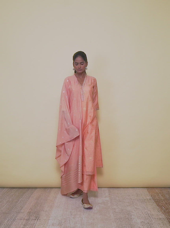 Peach Self Design Chanderi Silk Straight Kurta With Palazzos & Dupatta