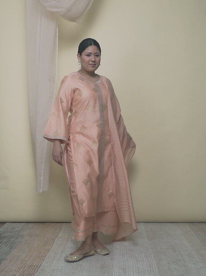 Plus Size Peach Self Design Silk Straight Kurta With Palazzos & Dupatta